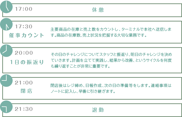 | 勤務時間 | 実働8時間 8:30~17:30(各部署により異なる) ※販売は店舗営業時間にあわせてシフト勤務  |